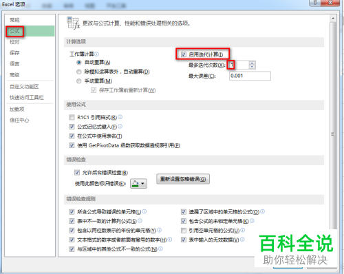 3.然后在打开的选择窗口中,先点击左侧栏中的”公式“选项,然后在对应的右侧栏中勾选”启用迭代计算“这个选项,并且设置”最多迭代次数“为1,设置好之后点击确定选项,