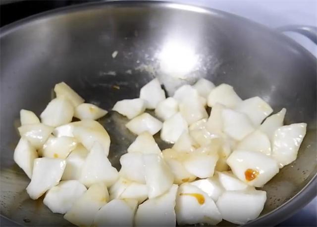 2.然后起锅加入少量的油,再加入少量的白砂糖,先炒一下糖色,炒糖色的时候,要小火慢慢的炒至焦糖色,下入萝卜块翻炒均匀。