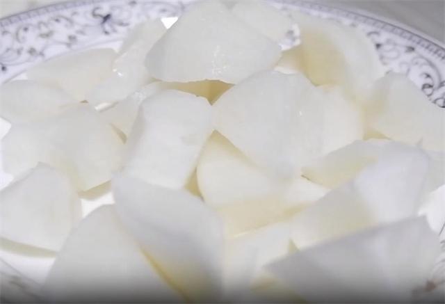 1.一根白萝卜洗净,然后去皮,我们再把它切成大块。