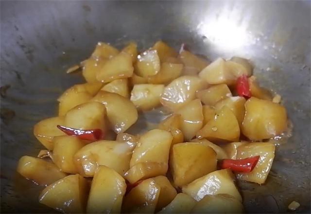 3.然后再加入葱姜蒜、红辣椒炒匀,再加入少量的酱油调味,少量的老抽调色,炒匀之后加入水,和萝卜持平就可以了,再加入适量的盐,少量的十三香,然后盖上锅盖,中火煮15到20分钟,等到汤汁收干就可以出锅了。