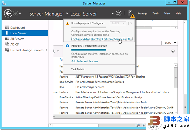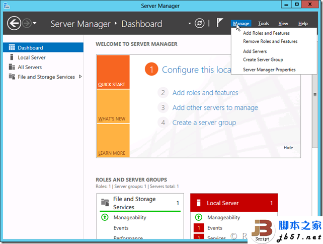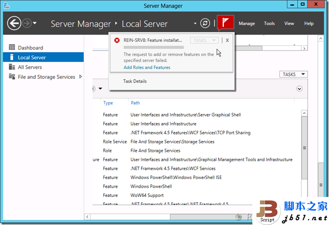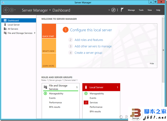 在某些功能安装完毕后需要配置,就会显示一个感叹号,表示完成需要配置。 如果在安装过程中出现了错误,小旗子就会变成红色,提示发生了错误。 这样的功能意味着可以同时安装多个功能或添加多个角色,并且不需要一直僵持在安装界面,在完成时或需要配置时会进行提醒。接下来再看看左侧,左侧相比旧版本的Server也发生了非常大的变化,变得非常的简洁,只有四个大块,分别是仪表板、本地服务器、所有服务器以及文件和存储服务。