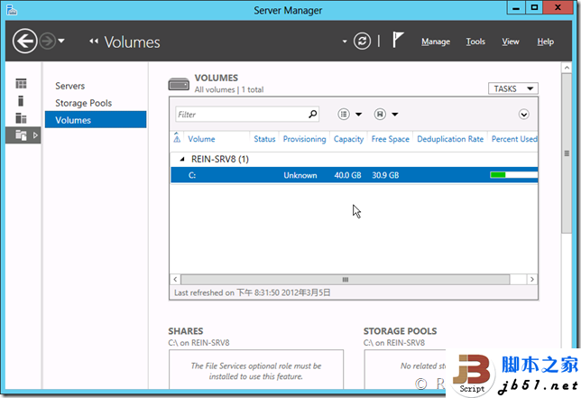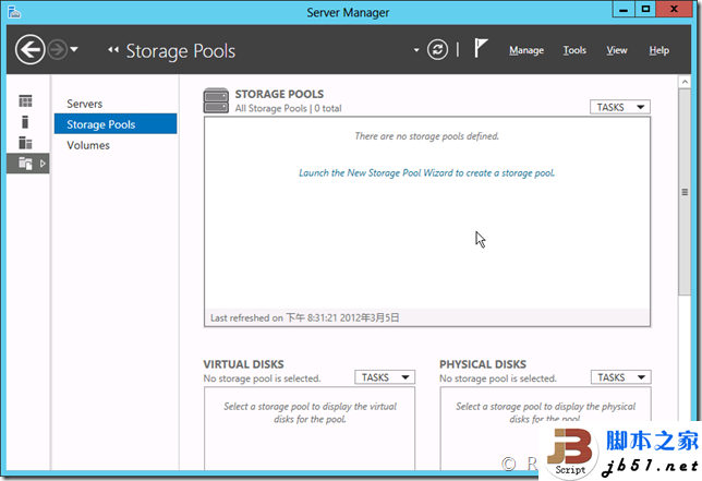 还有用于性能评估和分析的工具,基本上和服务器就有关的都能够在这里找到,但一点都不拥挤。 接下来是文件和存储服务,这也是Windows Server 2012变化很大的地方,文件和存储服务又分为三块,分别是服务器、存储池以及卷。服务器块主要显示当前所管理的服务器,可以将多个服务器进行同时的管理,还可以使用各种筛选设置来选择指定的服务器。 在文件喝存储下还有下存储池,这是非常有意思的一个概念。允许将服务器中的硬盘添加到存储池中,然后再在存储池中包含虚拟磁盘和物理磁盘。虚拟磁盘就是我们虚机主要使用的文件,包括VHD和VHDX。