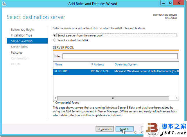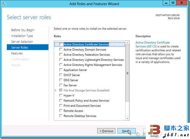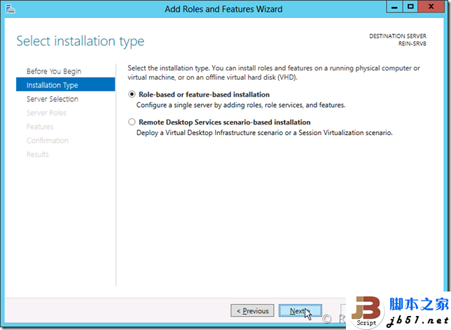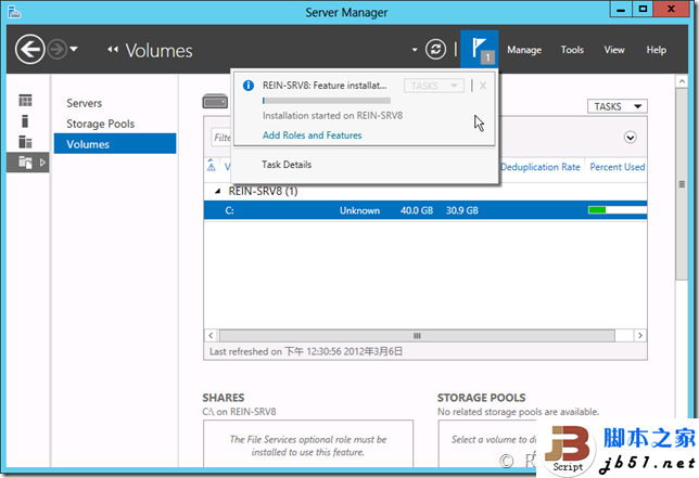 在Windows Server 2012里新的一种虚拟磁盘类型,后缀为VHDX。能够支持单虚拟磁盘2TB以上的容量,并且支持断电、意外的计算机停止的检错。 还有一个选项卡是卷,卷其实很好理解,就是RAID阵列的软件版,而不是由硬件来实现的,可以创建镜像、校验。在下面还有共享文件夹、存储池以及虚拟的iSCSI磁盘,并且可以看到文件服务器的结构。 整个服务器管理器差不多就这样了,下面来看一个实例,是用添加角色和功能向导添加.NET Framework 3.5的一个过程。首先打开添加角色或功能向导,会显示介绍,与旧版本的也完全不一样了。 接下来的一步与旧版本的Server完全不一样,会提示选择是“基于角色或基于功能安装”还是“基于远程桌面服务方案安装”。Windows Server 2012把Server划分成了两类,一类是传统的,一类是用于云计算虚拟化的。