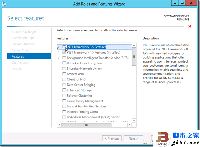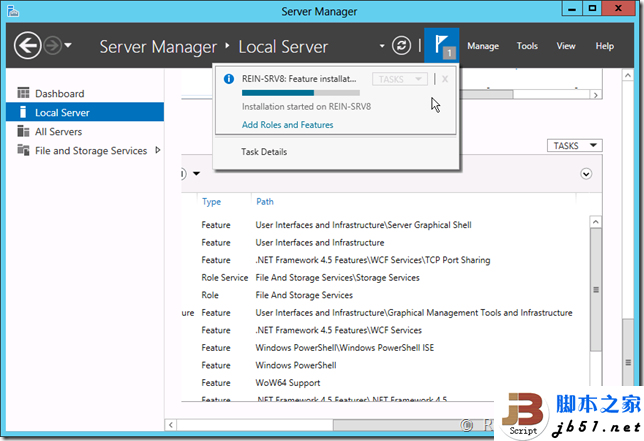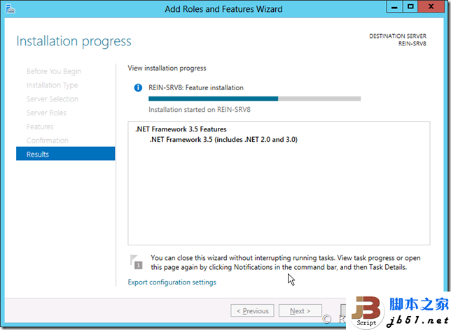 这样的划分能够更快更准确的部署好需要的服务器,比如选择“基于远程桌面服务方案安装”,此时左侧的步骤就会自动的切换到“虚拟化”方案步骤,并罗列虚拟化的角色和功能,完全屏蔽掉与此无关的功能,比如ADDS服务等。这里由于计划安装.NET Framework 3.5,所以就直接选择“基于角色或基于功能安装”即可。 之后会提示选择要添加角色或功能的服务器,可以选择本地的、局域网中的、服务器组中的,并且还可以选择基于虚拟磁盘的离线服务器,这里选择本地服务器。 然后提示选择要添加的角色,不添加角色直接跳过这一步骤。 选择.NET Framework 3.5然后会在顶部出现一个加载条,单击右侧的x可以取消添加功能的选择。这个在一些误选择添加较大的功能时还是很有用的,当然小的功能这个加载条是一闪而过的。 然后是确认页面,可以复选自动重启服务器如果功能需要的话,单击安装。 安装进度条很简单。 开始安装后就可以将向导关闭了,然后在服务器管理器的“小旗子”处可以查看安装进度和安装任务信息,单击关闭。 OK,在这里可以看到安装进度,耐心等待一下。