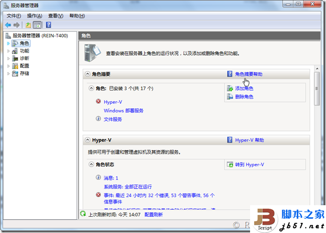 在上面的图中已经可以看到Windows Server 2012的服务器管理器的整个界面,那现在再来对比一下以前的Windows Server 2008 R2的服务器管理器: