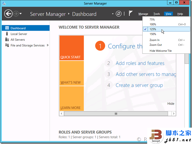 Windows Server 2012的顶部显得非常简洁,但内容非常丰富。顶部右侧的工具栏分别有管理、工具、查看以及帮助,可以完成旧版本服务器管理器中的绝大多数任务。 管理:这里可以添加、删除角色和功能,添加服务器及创建服务器组。 工具:这里的东西非常多,不知道各位朋友是否觉得眼熟,这非常类似旧版本Server里的“管理工具”。虽然没有了图标,但显得更加的简洁。相信熟练使用Windows Server的技术员对“管理工具”中的文字更加熟悉,而不是小图标。 查看:在查看里,我们可以调整整个面板的显示大小,可以更加方便的在不同设备上切换,比如平板和高分辨率的显示器之间。帮助:这里主要显示服务器管理器的帮助信息,比如帮助文件、TechCenter、TechNet Forum等。