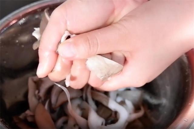 1.新鲜的平菇买回来以后,先撕成小块。