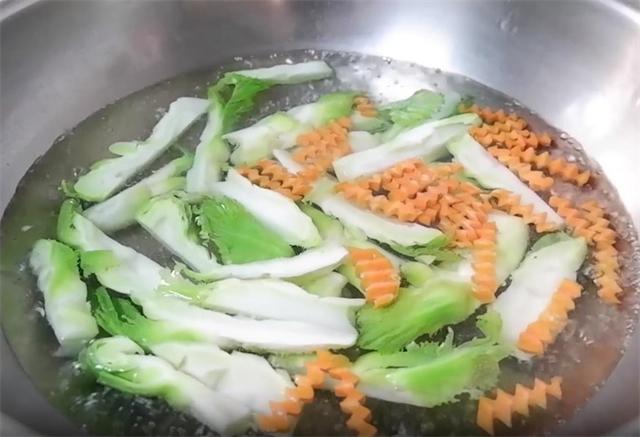 3.切好之后,我们把儿菜和胡萝卜开水下锅煮一下,再次煮开之后,三分钟后就可以捞出了。