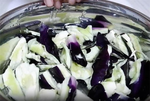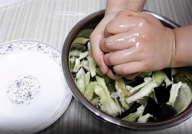 3.都准备好之后,把茄子从水中捞出,攥干水分。