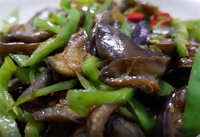 4.接着起锅,加稍多一点的油,然后下入茄子翻炒均匀,再加入姜蒜末、小米辣,然后中火慢慢炒,一直把茄子炒软,炒软之后,加入稍多一点的甜面酱或者是豆瓣酱,炒匀后加入少量的酱油调味,再加少量的白糖,然后加入青椒,大火炒至断生就可以出锅了。
