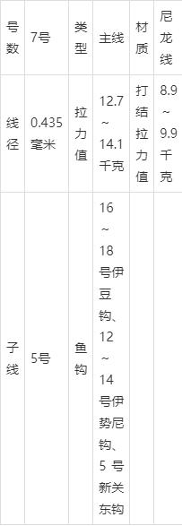 注:关于7号主线的信息,只能作为一个大致的指导,因为鱼线的实际性能可能因品牌和质量而有所不同。例如,不同品牌的鱼线,即使标称都是7号,它们的线径和拉力可能会有显著差异。更为复杂的是,某些低质量的鱼线为了表现出更高的强度,可能会采取“涨号”的手法,这无疑会对钓者选择合适线组造成困扰。 因此,在选择主线时,除了考虑号数之外,还应深入了解产品的品牌声誉、用户评价和具体规格。如果可能,最好亲自进行一些测试,以评估该主线是否符合您的实际需要。这样做不仅能帮助你更准确地选择到合适的鱼线,还能避免因选错线而导致的钓鱼失败或其他不便。