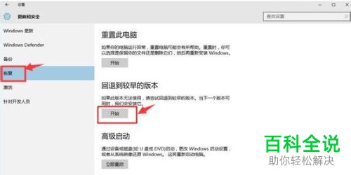3. 进入更新和安全的设置页面,点击左侧的“恢复”选项,在右侧就可以看到“回退到较早的版本”的选项了,点击下方的“开始”按钮。