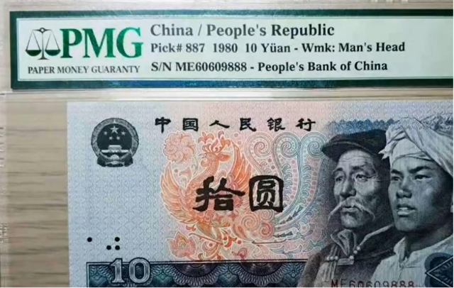 一枚1980年的10元纸币竟然要价5888,图片中这张纸币是一张1980年版的普通10元纸币,这张纸币卖家的要价是5888,它为什么这么贵呢?首先它是PM67分的高分币,然后再看看它的号码,是当下比较火爆的豹子号888,然后是倒置号,再加上圆圆号,豹子号、倒置号、圆圆号整合在一张纸币上,再加一个PMG67分的高分加持。
