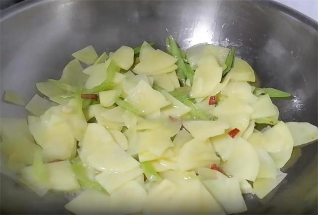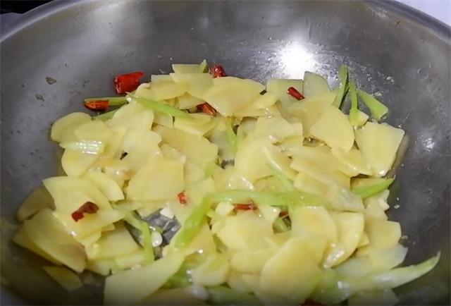 3.切好之后,起锅加入稍多一点的油,然后下入蒜末和干辣椒炒香,接着下入芹菜,把芹菜的香味炒出来,炒好之后,下入土豆片翻炒,炒的时候,可以加入少量的水,防止粘锅。