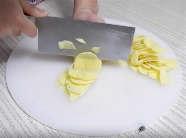 1.最近出门比较少,家中吃土豆是吃的最多的,不过也得换个办法做。今天我们就来做一个芹菜土豆片,一个土豆去皮洗净切成片,也可以用工具直接擦片,切好之后放入水中去一下淀粉。