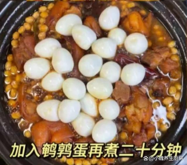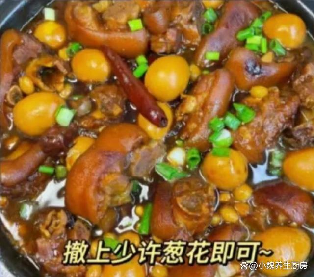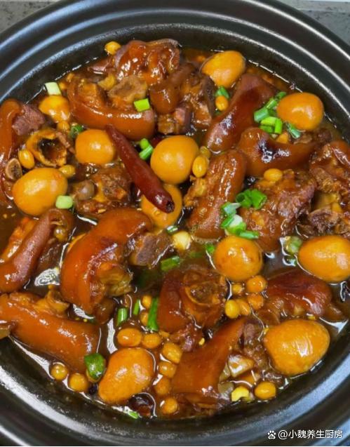 第六步:倒入泡好的黄豆,开大火炖煮一个小时,加入鹌鹑蛋炖煮20分钟,将其炖煮至软烂。 第七步:加上少许食盐和鸡精调味,焖煮至入味,撒上葱花点缀,这道黄豆猪蹄焖鹌鹑蛋就可以开吃了。 黄豆猪蹄焖鹌鹑蛋是一款非常开胃的菜肴,里面选用黄豆,猪蹄,鹌鹑蛋制作而成,猪蹄吃起来软烂脱骨,口感非常Q弹,里面全部都是营养,补充营养,滋润肌肤,让你们的胃口越来越好。 网友们,你们是否掌握这道黄豆猪蹄焖鹌鹑蛋的正确做法吗?(全文的配图都出自网络)