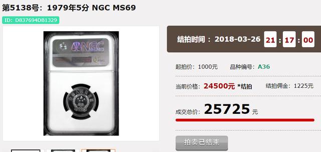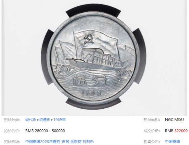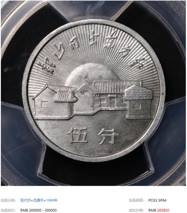 其中1979年的5分,更有拍出2万以上的纪录。只是,即便是5分的天王币,距离几十万还有很大的距离。 那么一枚30多万的5分,究竟是什么样子的呢? 我们就先来看看今年成交的2枚5分吧。 要30多万的5分在今年6月中旬举办的中国嘉德春拍中,一枚1969年的5分硬币,拍出了32.2万。