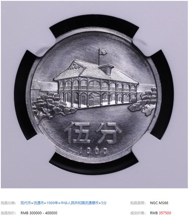 这枚硬币的背面图案是重要会议的会址,整个币面图案的还原度非常高。 这枚古老的5分硬币,依然光亮如新,得到了很好的保存,它拍出了35.75万! 这种币面图案精美的5分硬币,相信大部分人连连见都没见过。 实际上,我国在65年到70年,甚至都没有发行5分硬币。