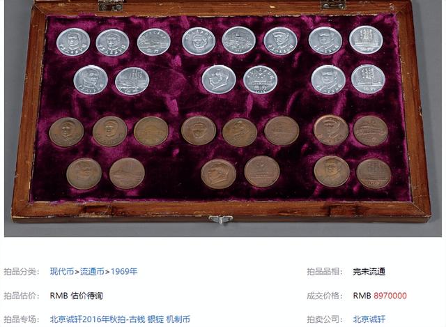 这枚5分的背面图案非常独特而精美,是一艘南湖船正在破浪前行,在精美图案的下方,这是5分面值和年号。 而到了7月,又有一枚1969年但币面却完全不同的5分,出现在另一场网拍中。