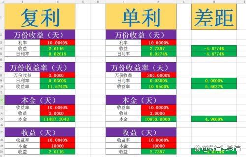 单利与复利的比较在金融领域中,除了单利之外,还有一种常见的利息计算方式叫做复利。与单利不同,复利考虑了本金和利息共同产生的收益。以下是它们之间的主要比较: 1、定义与计算方式: