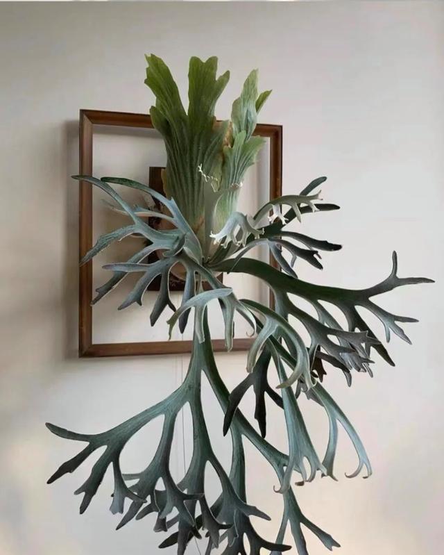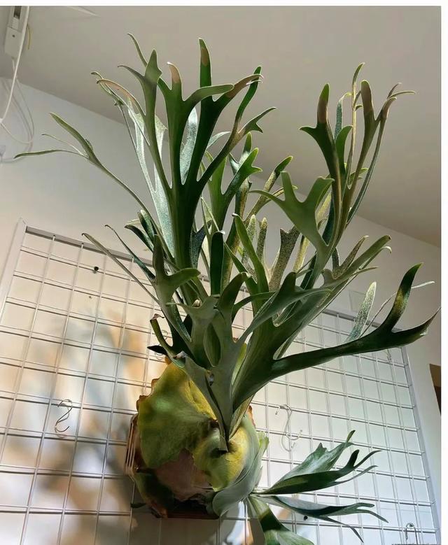 经过一番了解和研究,我得知这种绿植的名字叫做鹿角蕨。 鹿角蕨,近年来在植物爱好者中颇受欢迎,不仅因为其独特的外形,还因为它那难以言喻的生命力。 这种植物原产于热带雨林,对于湿度、温度有着一定的要求,但只要环境适宜,它就能茁壮成长,成为家中的一道亮丽风景线。 鹿角蕨的美,不仅仅体现在它的外形上。它的叶片常年翠绿,充满生机,即使在室内环境中,也能为空间增添一抹自然的气息。