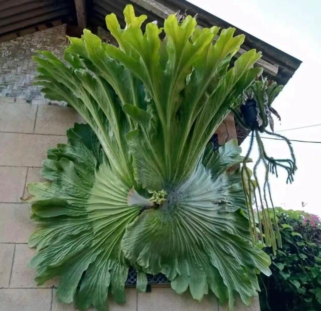 广东发现一户人家墙上的绿植,忍不住“哇塞”,长得又大又另类 生活不止眼前的苟且,还有诗和远方的田野! 前不久在广东的一次偶然发现,仍然让我惊艳不已。一户人家墙上的绿植,巨大而另类,让我忍不住“哇塞”出声。今天,就让我来分享这次奇妙的发现。 它硕大而奇特,叶子像翅膀一样张开,仿佛随时会飞翔。我走近细看,发现这棵绿植的叶子呈厚革质,酷似鹿角,充满野趣。我不禁好奇,这是什么神奇的植物呢?