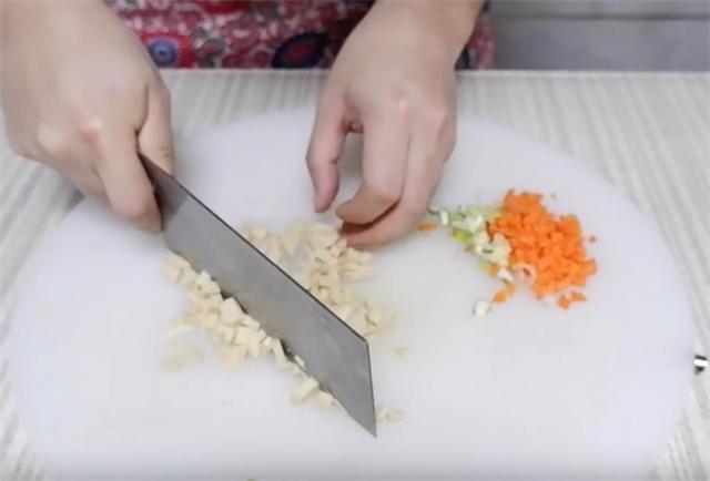 2.蒸土豆的这个时间,切一些胡萝卜碎、葱花和素火腿肠。