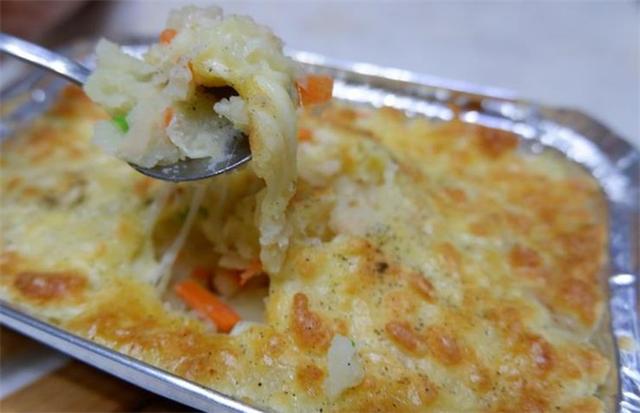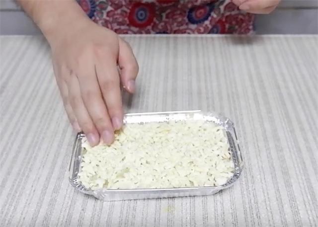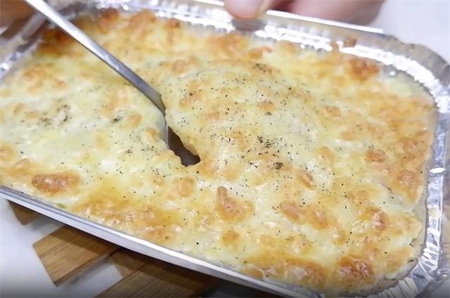 5.拌匀之后,放入锡纸盒中,如果家中有焗碗是最好的,把土豆泥铺平压实,在上面铺上一层芝士。