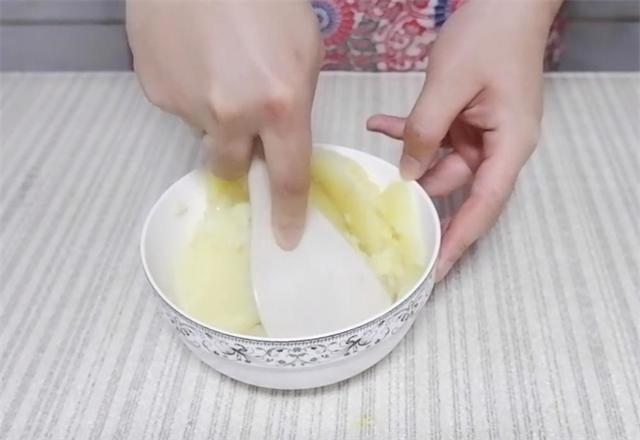 3.土豆蒸熟之后,在碗中捣碎成泥。