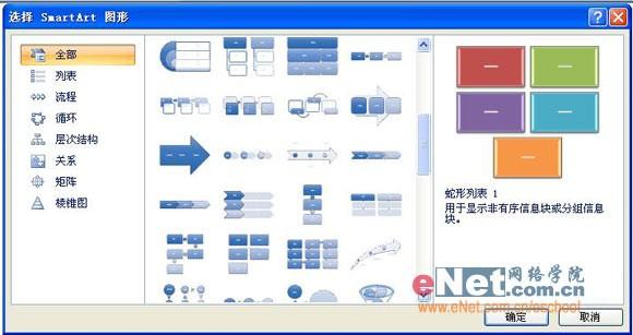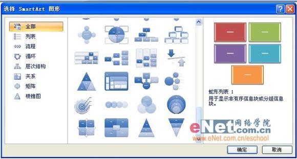2、点击SmartArt,可看到其图形库,提供了80种不s同类型的模板,有列表、流程、循环、层次结构、关系、矩阵、棱锥图等七大类。在每个类别下还分为很多种。