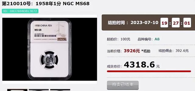 而在全新的硬币里还有相对品相更好的绝品硬币,它们几乎没有啥瑕疵和划痕市价也要高得多,比如图片中这一枚就是开头提到的那枚老1分,它是NGC68分的绝品58年1分硬币,所以拍出了4319。