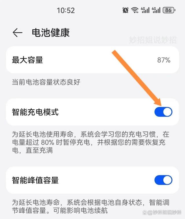 在这里就会看到有一个“智能充电模式”,它也是默认关闭状态的,我们需要给它后面的开关进行开启。打开之后,系统就会根据你的充电习惯来对手机进行充电以及断电。这样可以防止手机充电过多,有效地延长电池的使用寿命,同时也能减少充电时的发热情况。