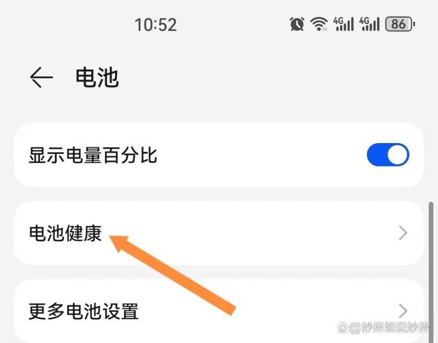 接下来,开启智能充电模式。同样是在设置界面,找到“电池”,点击一下,然后点击“电池健康”。