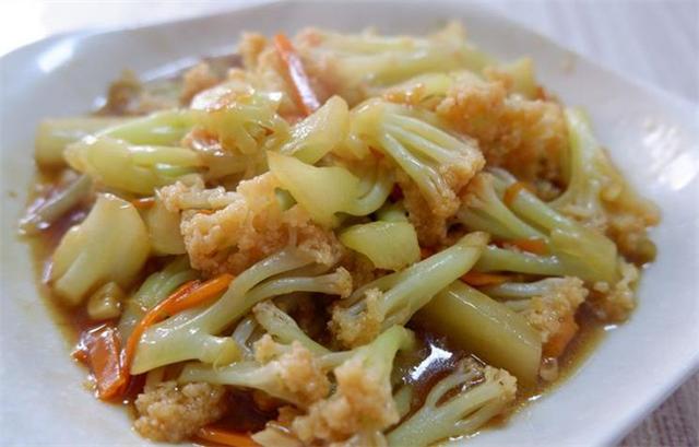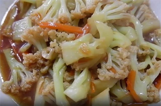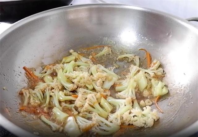 5.接着另起锅,加少量的油,下入蒜末炒香,再加胡萝卜丝炒一下,然后加入菜花翻炒均匀,接着加入少量的水,加素蚝油和酱油,炒匀之后,加入盐和味精,然后一直炒至收汁,倒入调好的芡汁,翻炒均匀就可以出锅了。