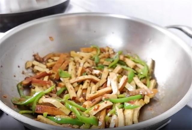3.然后起锅加入少量的油,油热之后加入葱姜蒜,花椒炒香,再加少量的豆瓣酱炒出油,然后加入香干翻炒均匀,炒的时候可以淋入少量的水,这样可以让香味更好的入味,炒匀后加入青椒,然后加酱油和盐调味,把青椒炒至断生,出锅前再淋入少量的水,翻炒均匀就可以了。