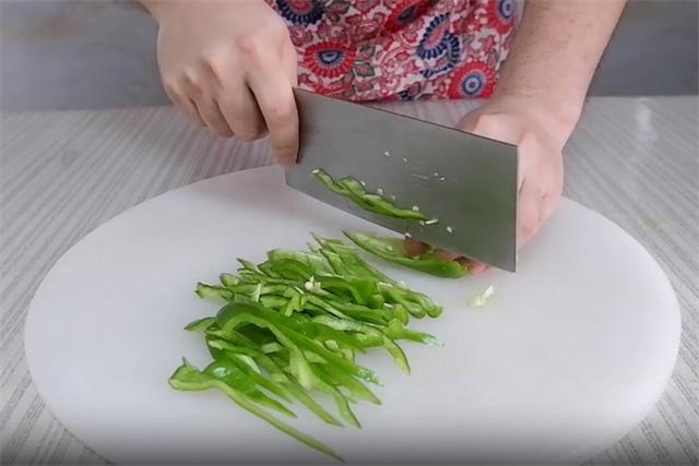 2.再切一个青椒,青椒最好是选辣一点的,同样切条就可以了。