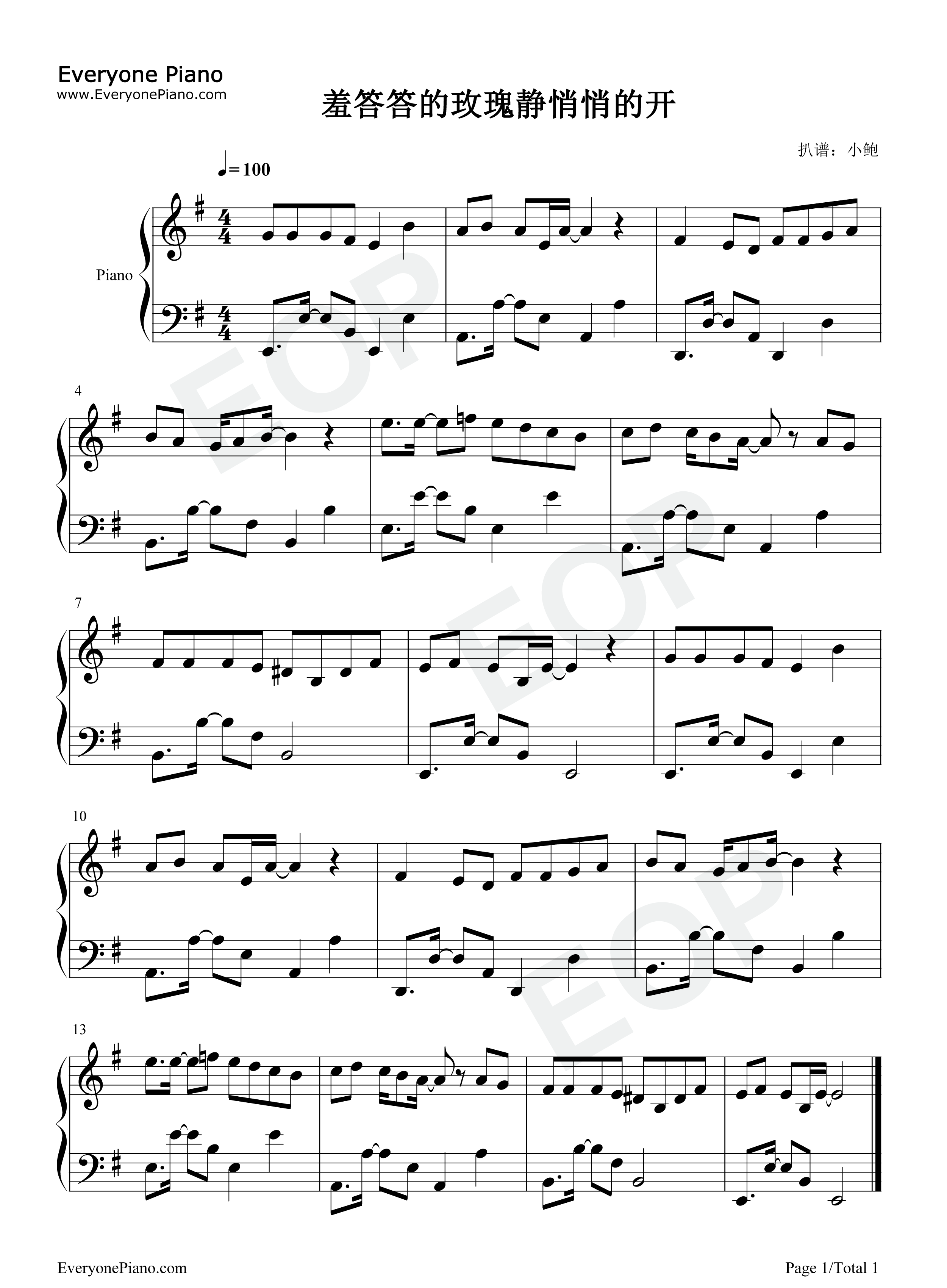 2019年3月14日,个人首支翻唱单曲《羞答答的玫瑰静悄悄地开》暖心上线,在(3月14日)当天,这位2001年出生,刚满18岁的新生代音乐人,用全新演绎的方式(加入rap元素),把这首经典的情歌,作为情人节礼物送给了所有歌迷。 这首曲子来自一位18岁小男孩对爱情的理解,在经典中注入了少年的青春活力,让人一听就印象深刻。小编听过很多版本,其他人的版本,都多少有一些悲伤的味道,让人感觉这朵玫瑰花要凋谢了。而这个大男孩用他辨识度极高的嗓音,把这朵玫瑰花羞答答的样子表现的淋淋尽致,有兴趣的朋友可以到网易云听听这首曲子。 小编写这个介绍的时候,反复听了十几遍,每次都身不由己的合着音乐扭动起来,竟然治好了多年的腰痛! (张老师:这就是你花费3个小时憋出来的介绍? 这首《羞答答的玫瑰静悄悄地开》由我们EOP独家制作,只是片段,让喜欢的童鞋学习一下弹奏。 曲子有点难度,左手小指跳跃弹奏,学过《魔鬼训练营》的小伙伴,练习,跟上1.0的速度就算合格过关。最早录出视频被采用的小伙伴,可以到官方QQ群张老师那里领奖。学不会的,或说不想学的,把PP洗白白,准备挨板子吧! 《羞答答的玫瑰静悄悄地开》歌词 羞答答的玫瑰静悄悄地开 慢慢地绽放她留给我的情怀 春天的手呀翻阅她的等待 我在暗暗思量该不该将她轻轻地摘 羞答答的玫瑰静悄悄地开 慢慢地燃烧她不承认的情怀 清风的手呀试探她的等待 我在暗暗犹豫该不该将她轻轻地摘 |