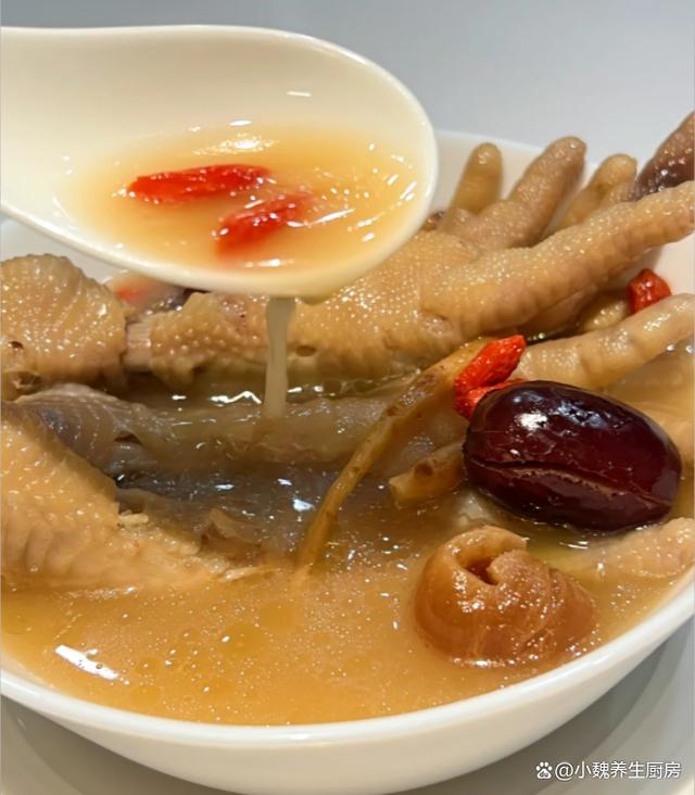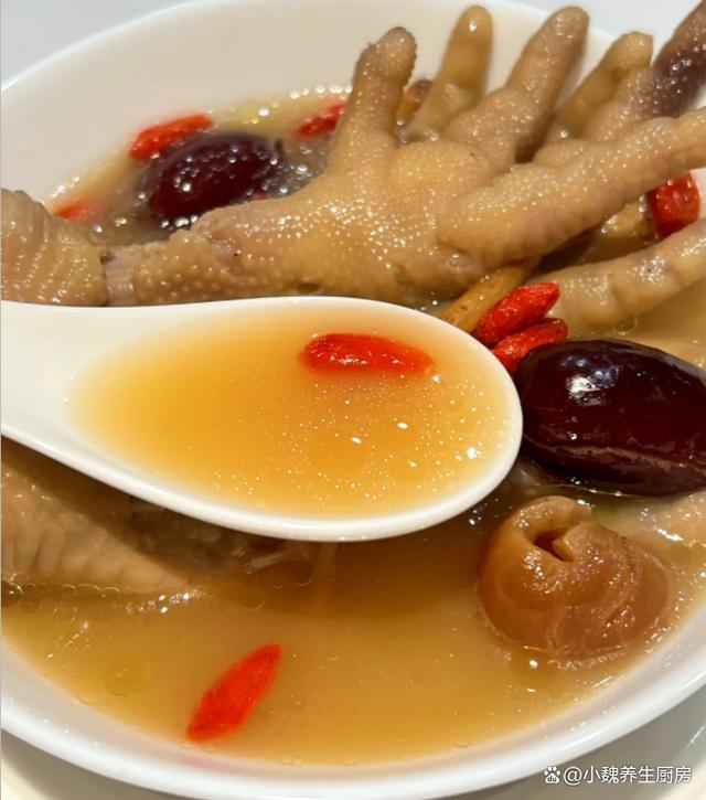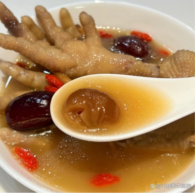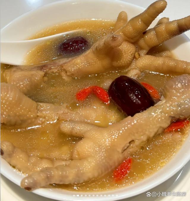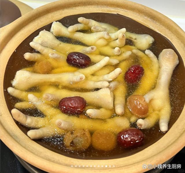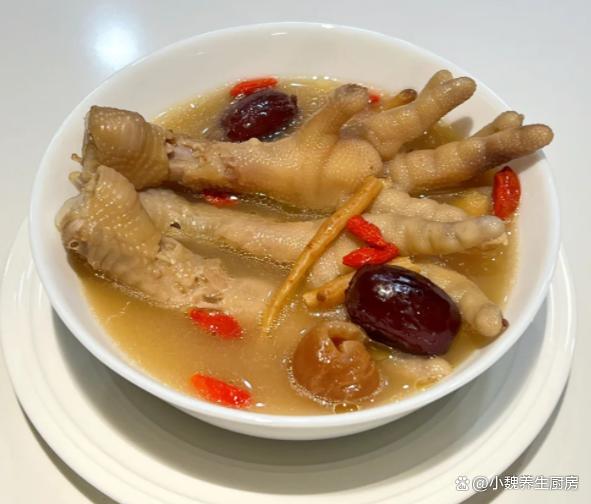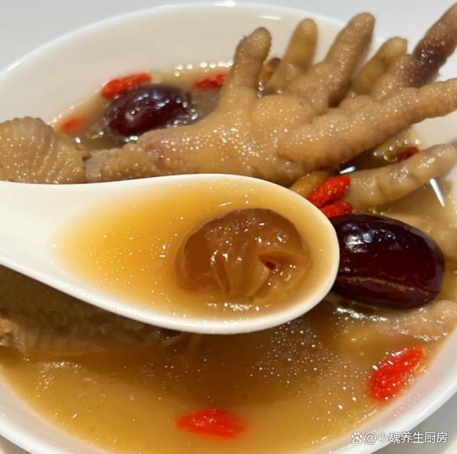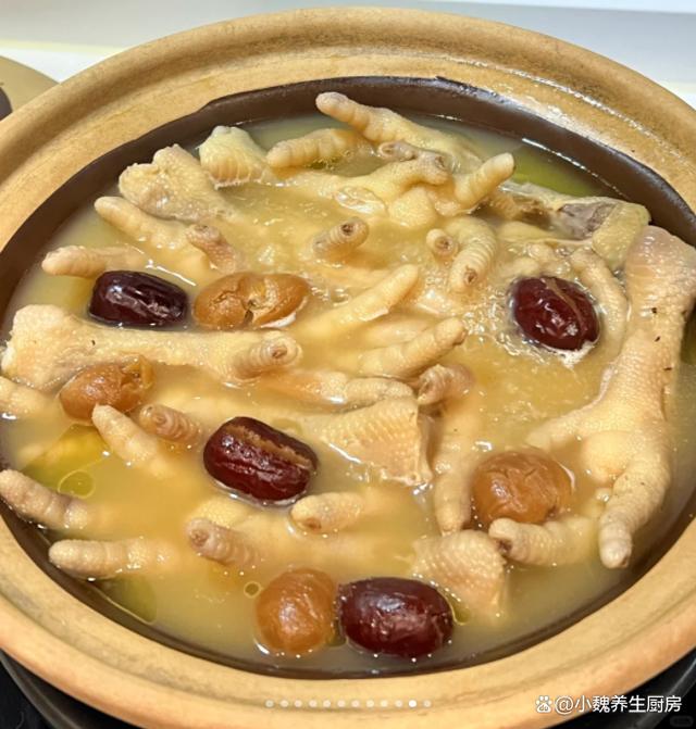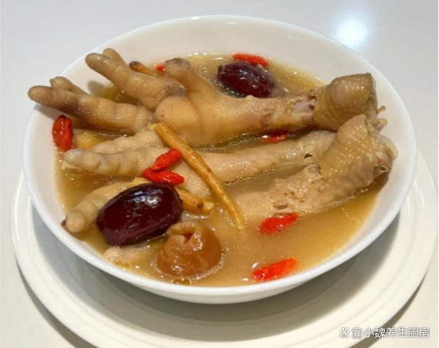 3:把鸡爪用冷水解冻,用剪刀去掉指甲,用清水冲洗干净,鸡爪倒入炖锅里,放入葱结和姜片,加上少许料酒,提前把鸡爪去腥焯水处理,温水冲洗掉浮沫,放在碗中备用。 4:准备好煲汤的炖锅,加上适量清水,放入桂圆肉,黄芪,党参,红枣和其他食材,加上足量冷水,炖煮半个小时。 5:然后放入处理好的鸡爪,鸡爪炖至Q弹,食材的营养都炖出来,调入少许佐料,焖煮至入味即可,一定要掌握好煲汤的火候,学会给家里人做一做。 当归桂圆红枣鸡爪汤的制作小贴士:首先,鸡爪的选择至关重要。尽量挑选色泽鲜亮、肉质饱满的鸡爪,这样的鸡爪不仅口感更佳,也富含更多的胶原蛋白,有助于美容养颜。处理鸡爪前,务必用流动水冲洗干净,并剪去指甲,以减少腥味,提升汤品的清爽度。其次,药材的用量需精准把握。当归虽好,过量则易上火,一般建议根据汤的分量适量添加。桂圆与红枣同样如此,它们不仅能增添汤品的甜味,还富含多种维生素与矿物质,适量食用汤品更加温润滋补。再者,炖煮的时间也是关键。慢火细炖能够使食材中的营养成分充分释放并融合,一般建议小火慢炖至少两小时,期间可视情况适当撇去浮沫,保持汤色的清澈。 最后,调味时尽量保持原汁原味,只需少许盐提味即可。如果喜欢更鲜美的口感,可以在出锅前加入一小把枸杞,不仅颜色更加诱人,还能增添一份天然的甘甜与健康。遵循以上小贴士,一碗色香味俱全的当归桂圆红枣鸡爪汤便能轻松呈现于餐桌之上,不仅暖身更暖心,是家人朋友共享的美味佳肴。 当归桂圆红枣鸡爪汤是一款补血补气的汤品之一,到了秋季中期,天气慢慢渐渐转凉,身体特别虚弱,里面添加当归,桂圆,红枣等食材,都是补血的食材之一,搭配鸡爪炖一锅,滋补身体,气色越来越好,抵抗力增强。 网友们,你们是否掌握这款当归桂圆红枣鸡爪汤的制作技巧吗?(本文的配图全部出自网络)