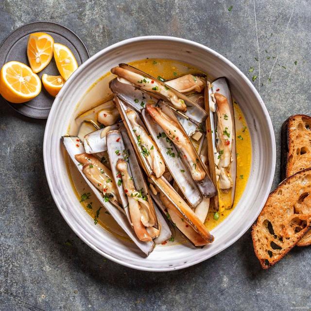 扇贝是一种具有重要营养价值的海鲜食物,其可食部分主要富含蛋白质,与鱼类和虾类相似。扇贝集食物、药物和滋补品于一身。常见的扇贝烹饪方式包括扇贝汤、蒜蓉蒸扇贝和炭烧扇贝等。现在各大烧烤店的菜单上都少不了蒜蓉蒸扇贝。蒜蓉蒸扇贝是一道美味独特的菜肴。扇贝肉质白嫩细腻,配上纤细爽滑的粉丝,再加上热油的浇灌,将蒜蓉的香气发挥到极致。火红的辣椒、翠绿的香菜、金黄的蒜蓉、晶莹剔透的粉丝、奶白色的扇贝肉,这几层绝美的味道交织在一起。蒜蓉蒸扇贝以其独特的口感和丰富的调味,成为一道让人陶醉的佳肴。 5、蛏子