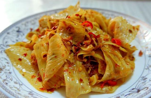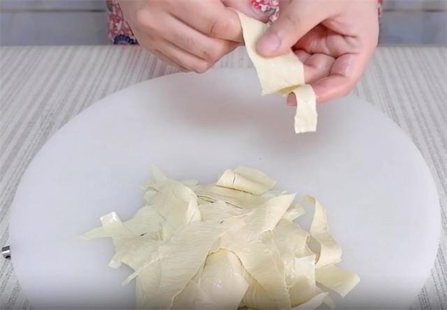 1.今天用豆皮做一个好吃的香辣豆皮。豆皮泡好之后洗净,用手撕成小块。