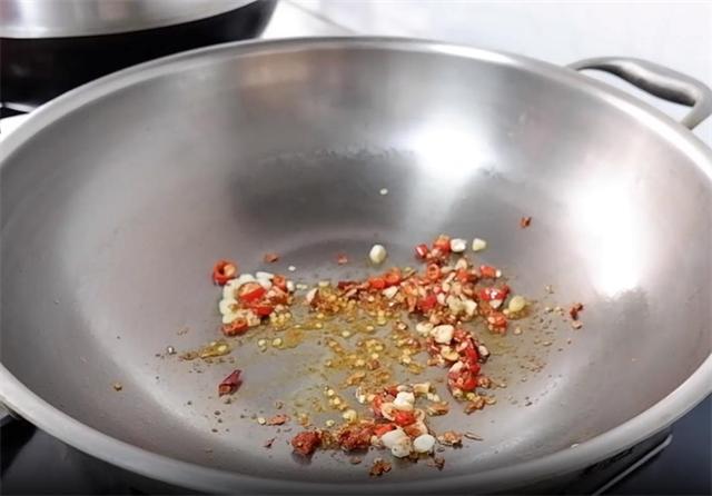 3.起锅加入少量的油,下入蒜末、小米辣炸香,再加一大勺的辣椒粉炒出辣味。