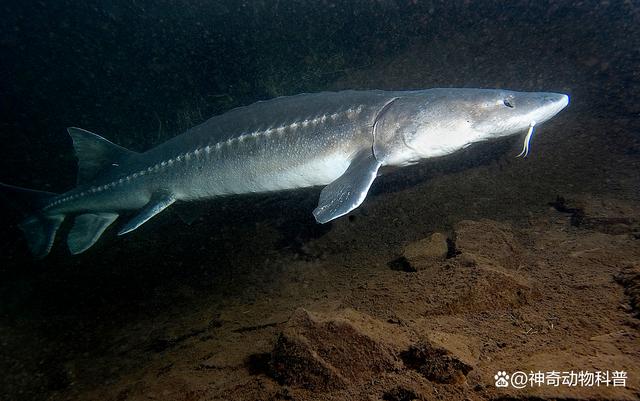 人们对蝠鲼还有一个熟知的称呼,那就是魔鬼鱼。魔鬼鱼的体长可以达到7米,而体宽最大可以达到8-9米。由于它们巨大的身躯,在海洋中只有少数几种大型鲨鱼和鲸类才能捕食到它们,例如虎鲨和虎鲸。 与传统鱼类不同,魔鬼鱼没有纺锤形的身体,也没有背鳍。它们宽阔的三角形胸鳍和类似风筝的身体结构使其能够执行旋转式的跳跃动作。随着旋转速度的增加,蝠鲼迅速上升并跃出海面,通常可以跳出水面1.5米的高度。 6、高首鲟(20米)