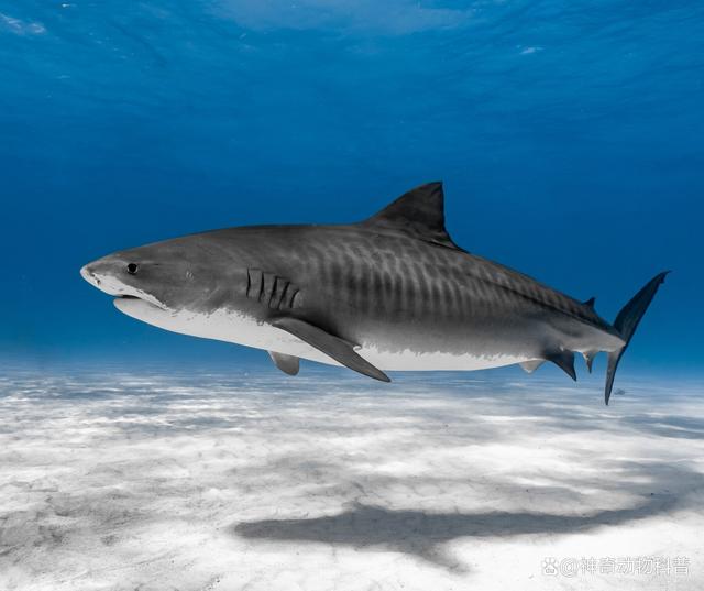 大白鲨,也被称为噬人鲨,是世界上最凶猛的食肉鱼类之一。它的体长可达6.5米,体重达到3200公斤,雌性较雄性稍大一些。大白鲨的身体庞大而肌肉发达,尾部呈新月形。它们具有大而锯齿状的三角形牙齿,牙齿长度可达10厘米。 大白鲨最早出现于中新世,并且是唯一现存的噬人鲨属成员。在所有鲨鱼中,大白鲨是唯一能够将头部直立于水面上方的鲨鱼,这赋予它们在水面上觅食时的优势,能更好地寻找潜在的猎物。 8、虎鲨(6米)