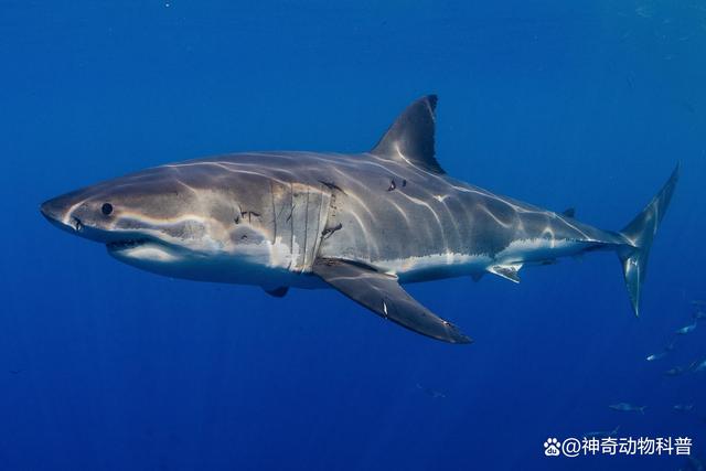 高首鲟,也被称为美国白鲟,可以达到最长七米,体重超过800千克。它的身形呈纺锤状,全长约为头部长度的4倍,体高的7.1倍,是北美淡水鱼类中最大尺寸的一种。高首鲟具有宽大的头部和相对较小的眼睛。它的性成熟期相对较长,雌性高首鲟需要长到至少1.5米,而雄性则需要长到1.2米。雌性高首鲟的体型也比雄性大得多。高首鲟的尾柄较长,尾部稍微弯曲,并且全身无鳞,被一系列的骨板所覆盖。背部的骨板较大且呈尖形。 7、大白鲨(6.5米)