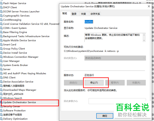 6. 最后先找到并双击【Update Orchestrator Service】,接着根据下图所示,点击【停止】选项,然后点击【确定】即可。
