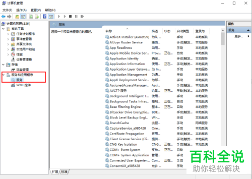 2. 第二步打开【计算机管理】窗口后,根据下图所示,依次点击【服务和应用程序-服务】选项。