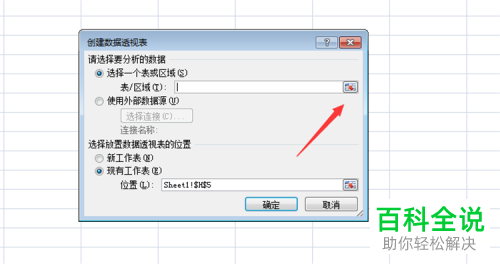 4. 如图,弹出创建数据透视表的窗口,点选上选择一个表或区域选项,然后点击右侧的拾取按钮。