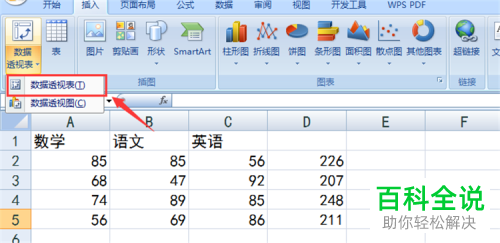 3. 在打开的插入选项下,选择数据透视表的下拉箭头点击,在打开的菜单中,选择【数据透视表】选项。