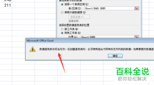 7. 如图,就会弹出【数据透视表字段名无效】的提示窗口了。