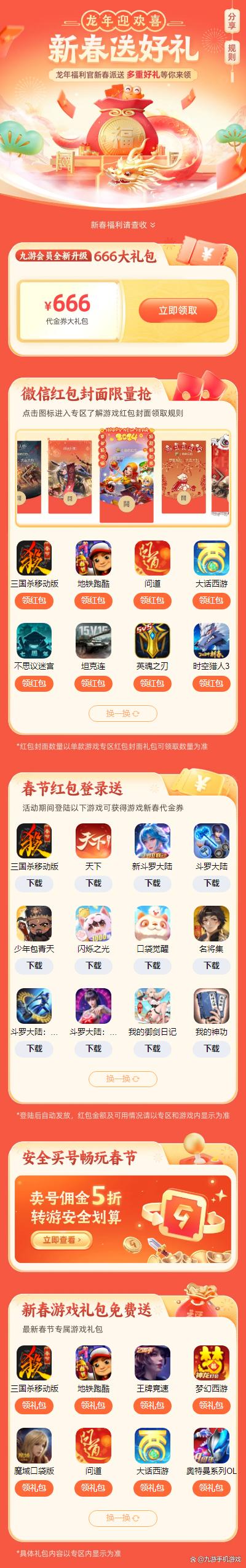 在这即将到来2024新春佳节,九游福利官带着多重好礼喜迎龙年!为此筹备的各式春节活动也正式开始啦!九游将于各位朋友们共庆佳节!新的一年,九游将继续努力打造更好的游戏服务平台,感谢大家对九游平台的支持与建议,新春之际,祝大家心想事成,万事如意! 新春好礼活动内容如下: 一、九游会员全新升级,更多福利代金券等您来拿! 二、红包封面限量抢,数十款游戏红包封面任您选! 三、春节红包代金卷免费送,更多福利免费领! 四、春节期间游戏账号买卖上交易猫更划算! 五、新春游戏礼包免费送,多样专属礼包领不停!